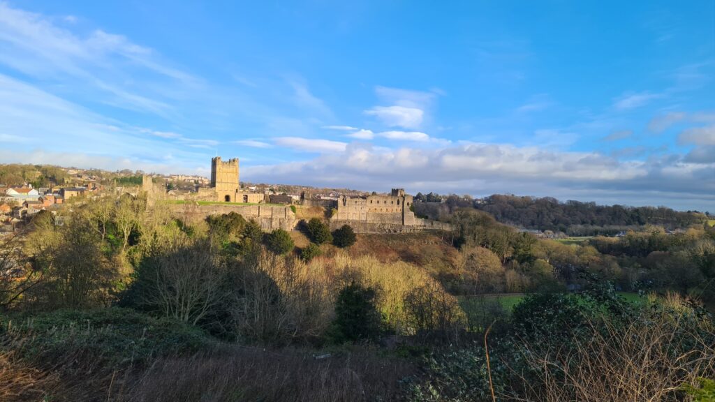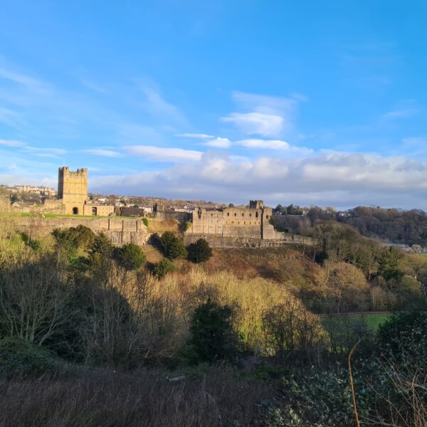 A delightful winter walk from the historic town of Richmond, through meadowland, woods and hillside tracks with many spectacular views including probably the best there is of the Castle. We take in Richmond Falls and walk on the less used south side of the river. Our first climb is up Sleegill to "Boggy Lane" and through grazing pasture looking down on Richmond and Round Howe Woods.