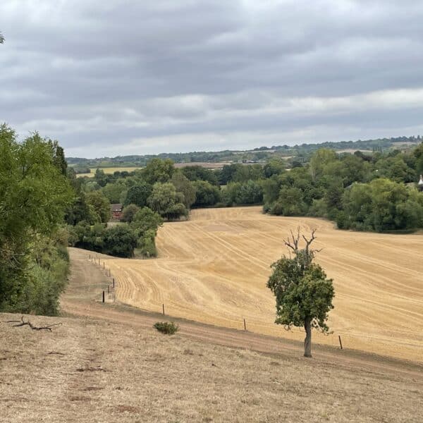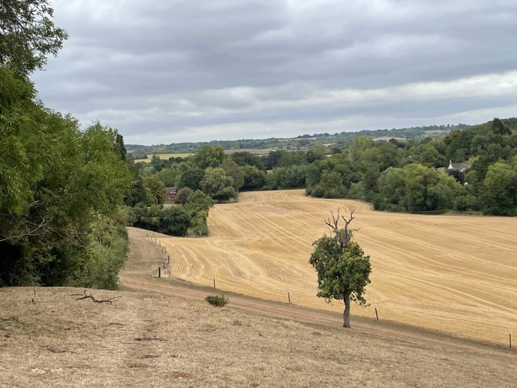 An eight mile ramble around very rural Worcestershire. Staring at the lovely village of Alfrick, we skirt alongside Hayley Dingle, then drop down into the hamlet of Brockamin. From there we make our way to Leigh Court - in the grounds of which is the largest cruck-framed building n the UK - built for Pershore Abbey in aound about 1325 and is well worth seeing. On from there, we make our way back to Alfrick, joing up with, and crossing Leigh Brook. There are distant views of the Malverns and Suckley Hills to add to the gentle scenery. In August after this incredibly dry summer, it was very much a parched landscape. Hopefully it will have greened up by October.