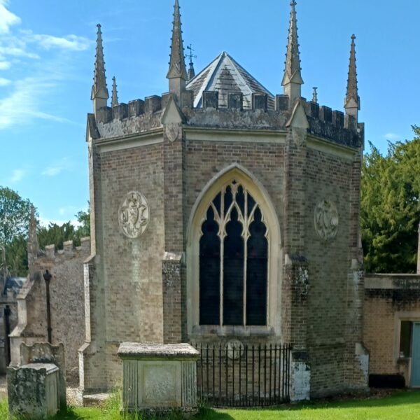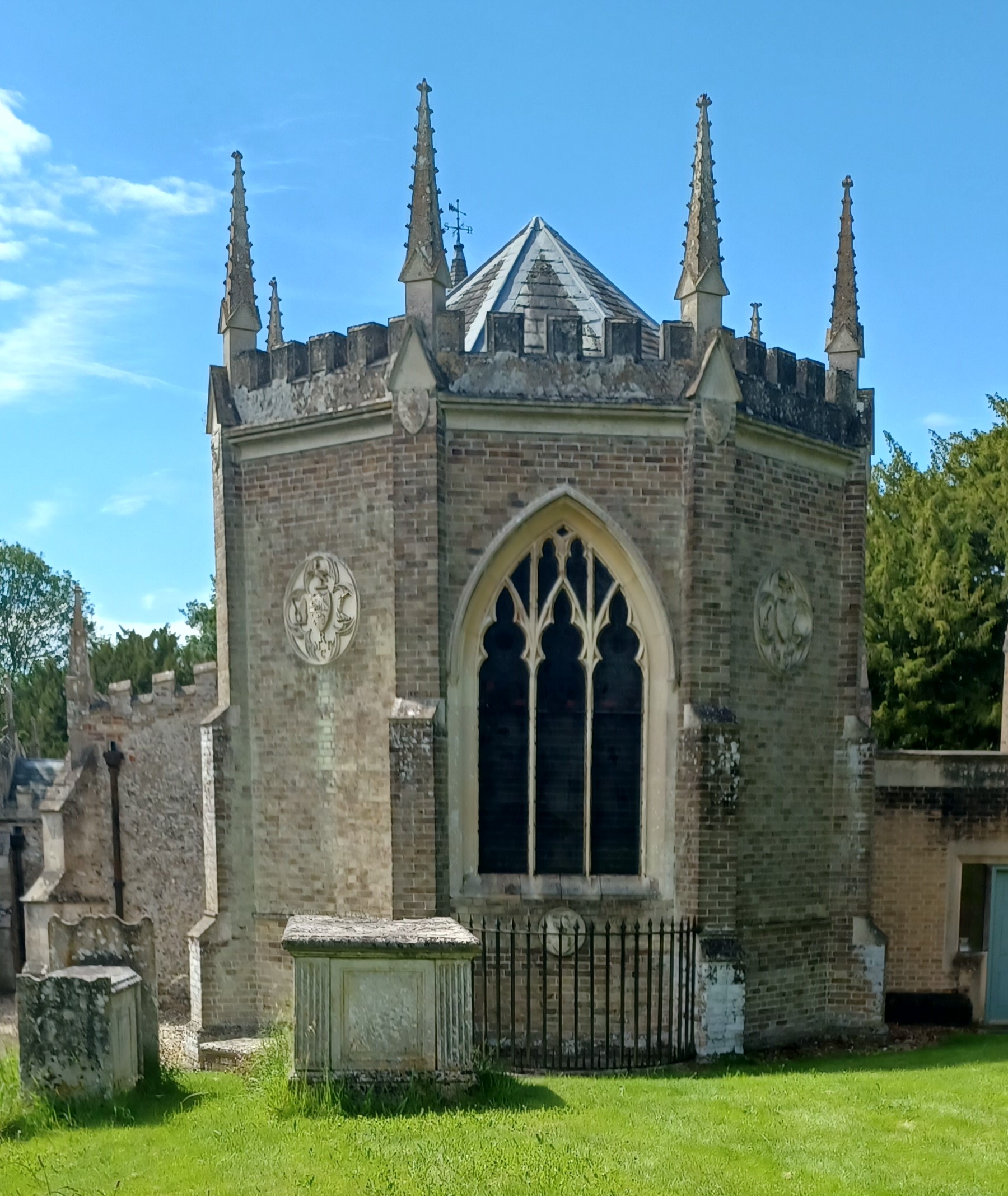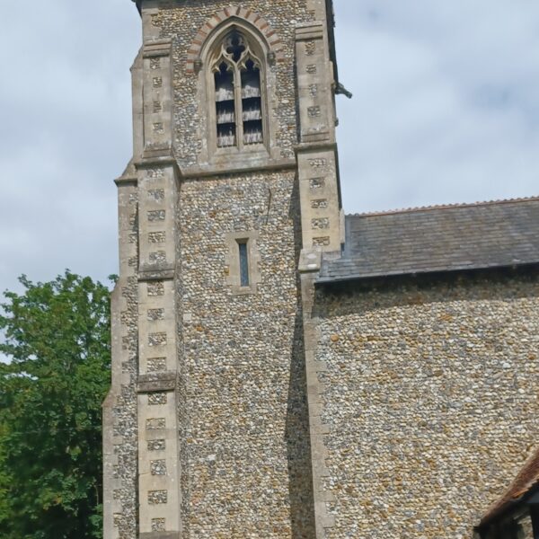 We skirt the southwest corner of Debden, to follow a minor road to the church of St Mary the Virgin and All Saints, peculiarly spiky outside, but  dignified and simple within.  After walking through the churchyard we pass a large apparently unused red-brick building and cross a bridge over a limb of the extensive lake situated in the grounds of Debden Hall, a country house demolished in the 1930s, and through fields to reach a minor, but busy, road, which we follow for a short distance before turning to follow the valley back to Newport.