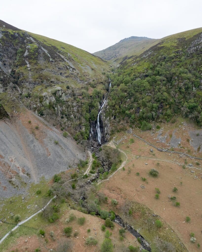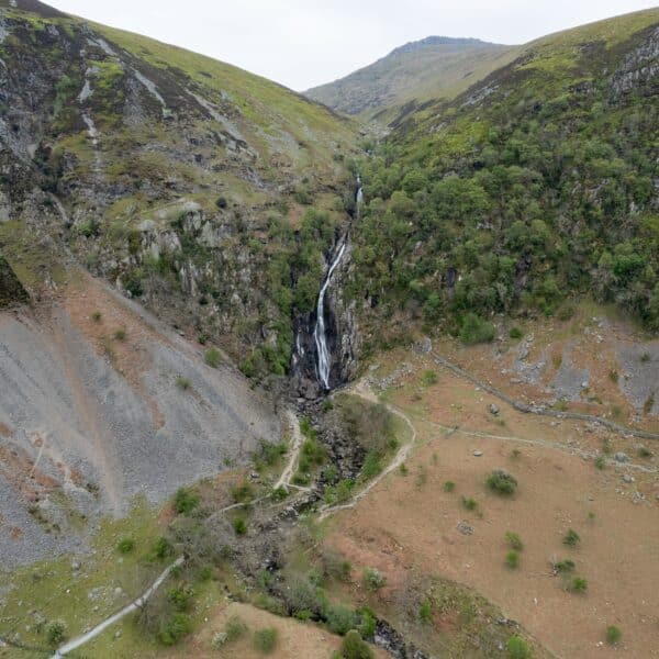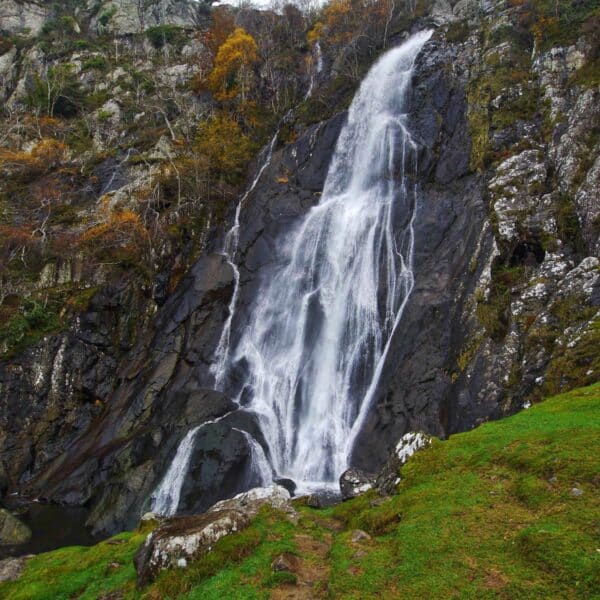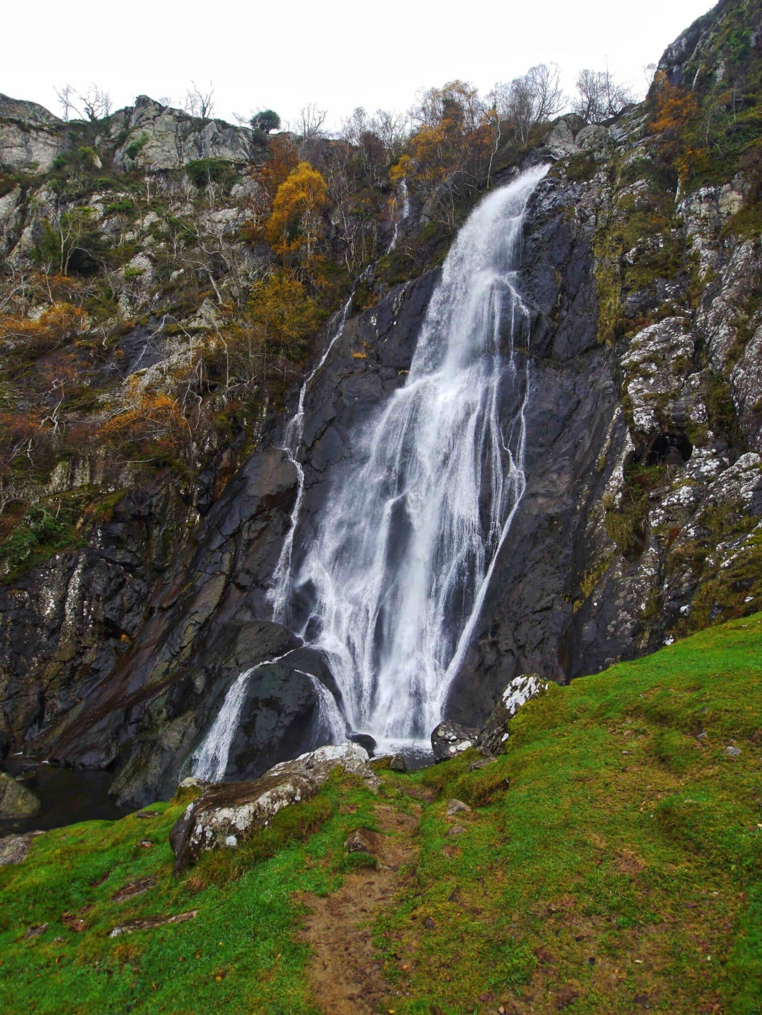 This is a beautiful circular walk to Rhaeadr Fawr (Aber Falls). Starting at the lower Aber Falls car park, you walk through a small section of wood along the Afon Rhaeadr Fawr before crossing the stream and continuing on the main path through the valley. The path to the falls is a well-maintained gravel path, with a steady incline. Just before arriving at the falls, you'll pass the remnants of an Iron Age settlement, the Aber Valley Hut Circle, which was built around a Bronze Age standing stone.