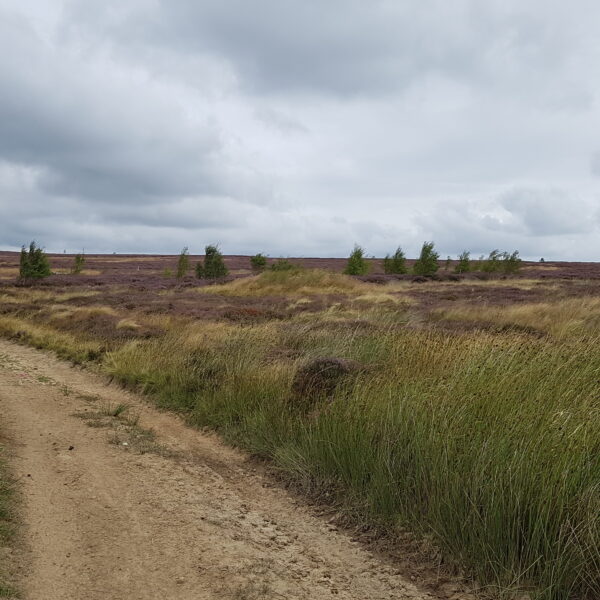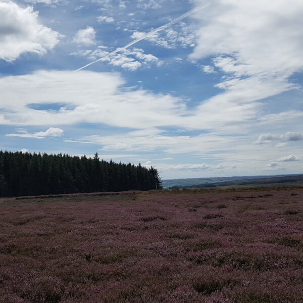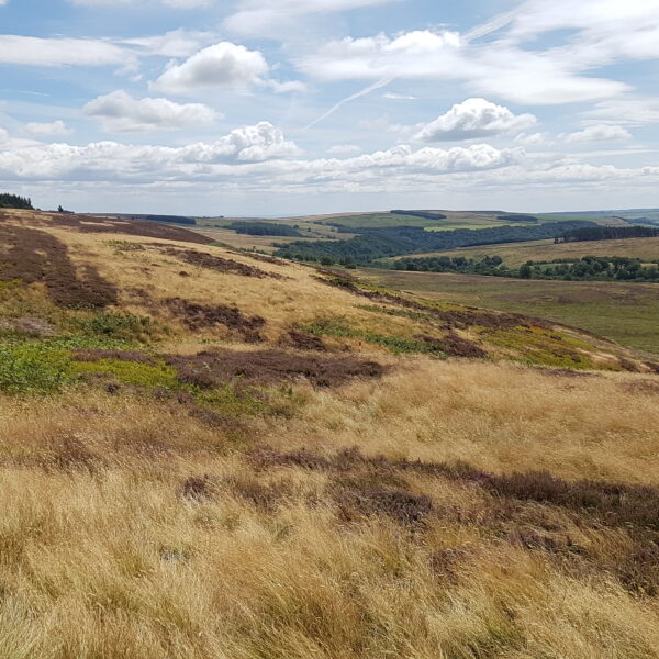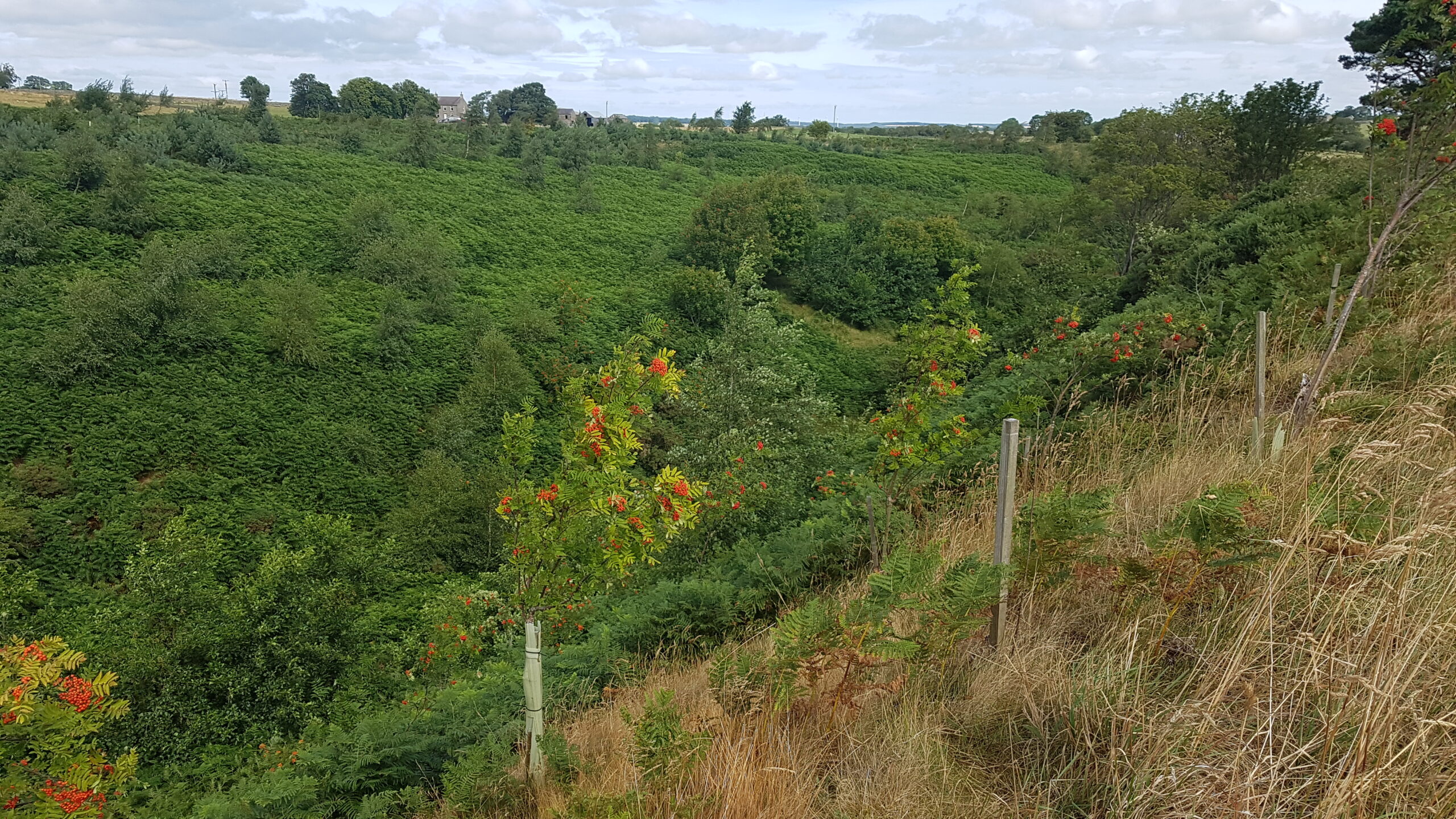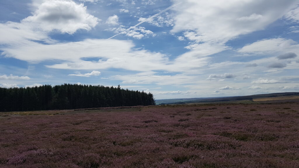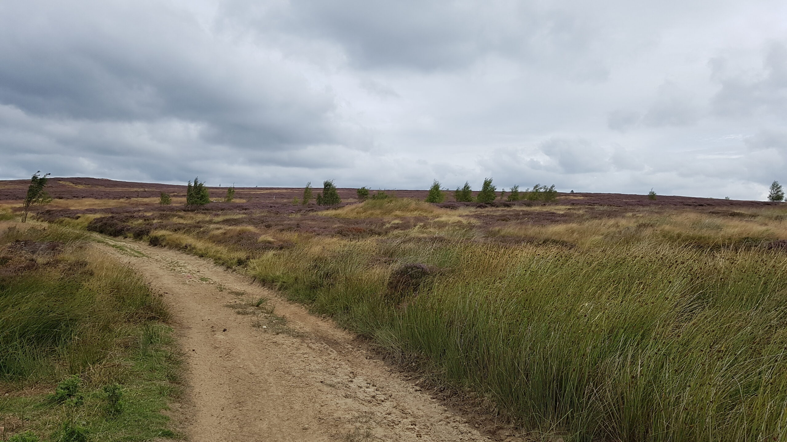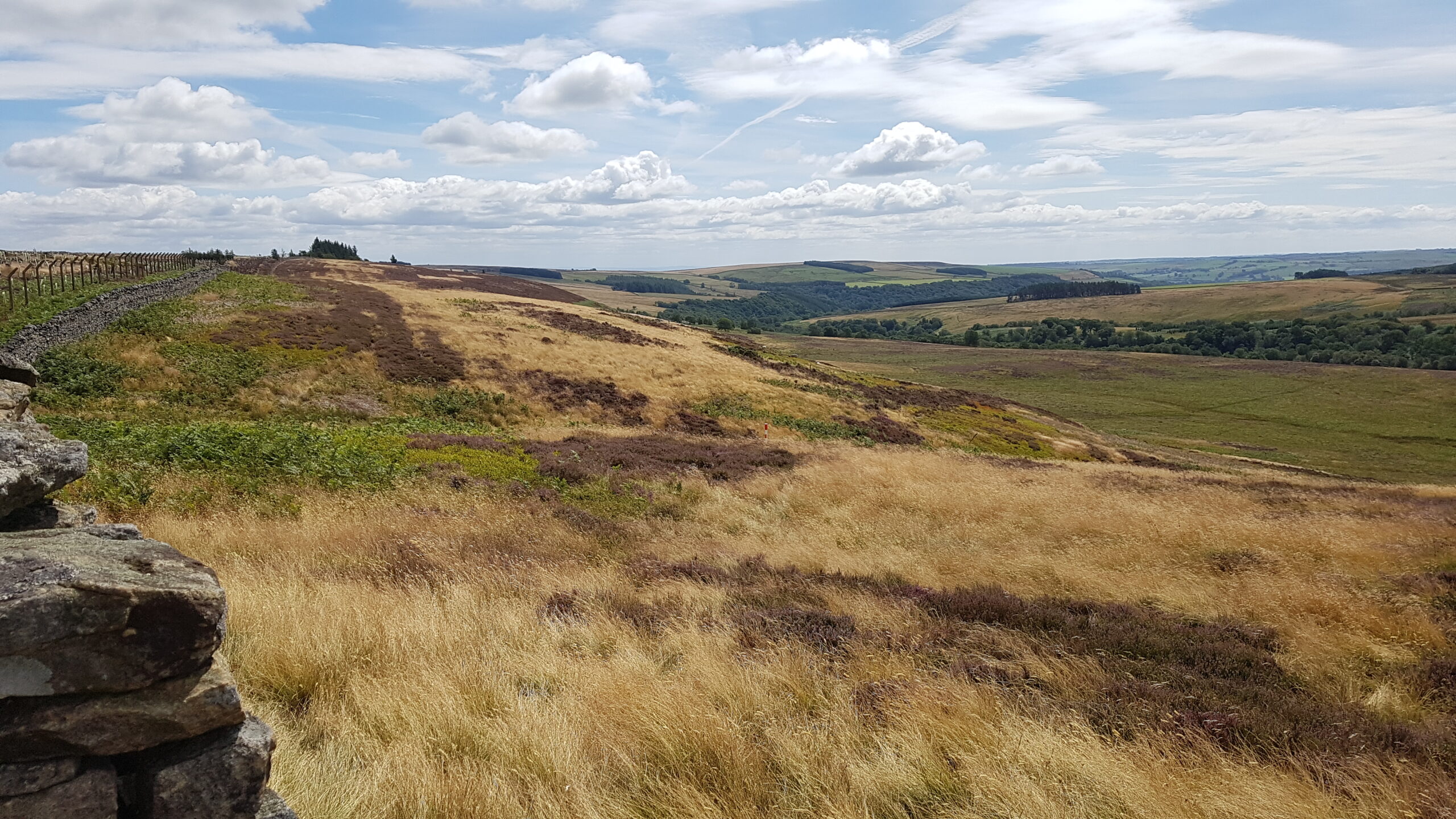 We then climb a little through fields and cross open moorland to join the edge of a wood. we follow this for a short distance before turning onto a semi rough path and then scrub land before making our way back to the start point.