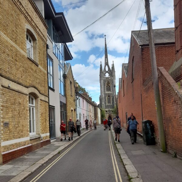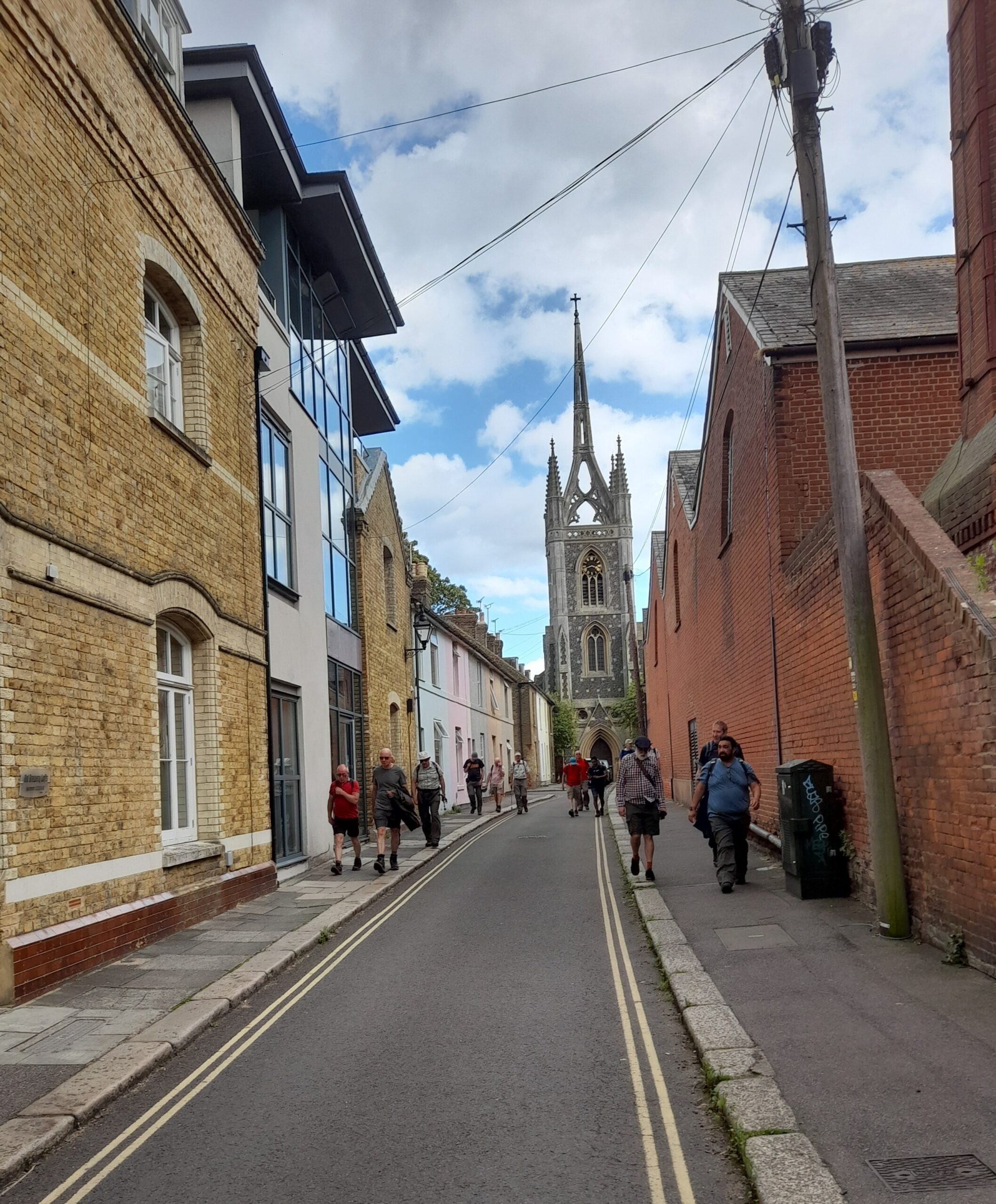 Contrasting weather for last day of the gathering, with a wet Monday for walks: an historic walk from Deal to Walmer; another chance to do the linear walk from Dover to Deal across the White Cliffs; west of Canterbury, following the Crab and Winkle Way to Harbledown then via Blean Woods and Chartham Hatch, finishing at Canterbury’s Westgate Towers. There was also a garden visit of ground of Chilham Castle, 7 miles south-west of Canterbury, with chance to view the grounds of the restored garden of the Jacobean mansion.