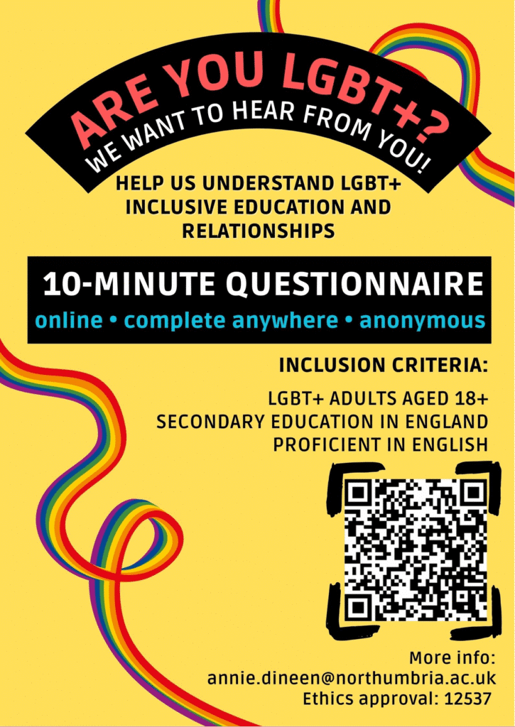 I am a postgraduate student at Northumbria University, conducting research on LGBT+ relationship and sex education and its association with relational and sexual assertiveness in LGBT+ adults. I am seeking your support in reaching potential participants for my study.
