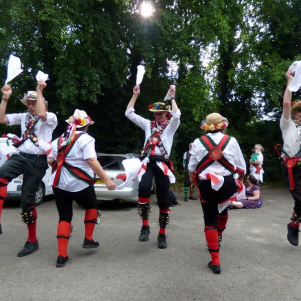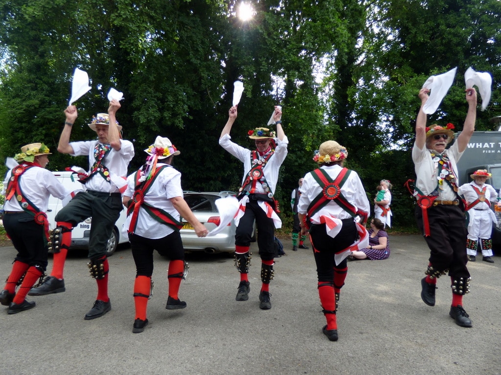 - Unexpected Morris dancers in the pub area! At the start of the walk, a troop of Morris dancers were finishing a dancing session outside the Two Brewers Pub, Chipperfield. Oh, well, we missed them, then. Shame. At the optional pub stop at the end of the walk, somebody noticed a sign that Morris dancers were to arrive imminently. The Morris dancers included troops from Wimbledon, Harrow and Nottingham, all three troops of which performed two set-piece dances each, followed by a finale that featured all three troops at once. A most entertaining and pleasant surprise! A notable feature of all of the dances – particularly those involving sticks – is the extreme discipline and timing of the dance. Another notable feature is the role of “the fool”: typically a leader of the troop, the “fool” is the dancer whose moves interrupts – or seeks to interrupt – the flow of other dancers, sometimes forcing a rotation of the dance partners. Throughout, musical accompaniment comes from one or two Morris dancers playing traditional instruments, typically performing a ditty, or a diggly-diggly piece, in strict tempo, and at a fair pace.