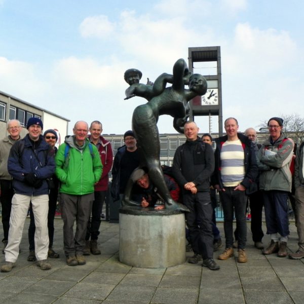 On leaving the Old Town area, we had lunch in the Town Centre Gardens, where we watched swans chasing geese and pigeons chasing other pigeons, presumably for different reasons. Then we headed into the new town centre - drawing attention to Hertfordshire’s only Korean restaurant, Gangnam, and the subtle design features to prevent rainfall flooding the shops and the breaking of stiletto heels (meaning we could point to a drainhole cover - yay!) - and had a look at the Clock Tower, completed in 1959, carrying one plaque to commemorate the Queen’s opening of Britain’s first pedestrianised shopping centre, and another plaque to commemorate Lewis Silkin. An elevated platform hosts a bronze sculpture called Joy Ride, by the Czechoslovakian sculptor Franta Belsky, which depicts a mother carrying a child on her back. We thought this was an appropriate place for a group shot.