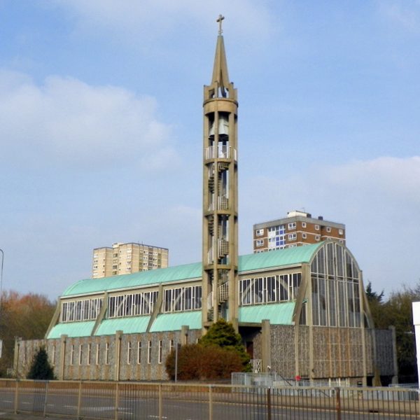 Our next stop was the church of St Andrew and St George, which was built between 1957 and 1960. It is the largest parish church built in England since world war two, and its foundation stone was laid by HRH Queen Elizabeth the Queen Mother. It became the main civic church for the town, and the ancient St Nicholas’ was casually demoted, leading to sarcastic comments that the daughter was older than the mother. In 1970, Stevenage was divided into seven parishes, so St Nicholas’ regained its former status, the Holy Trinity became a parish church for the first time, and St Andrew and St George’s was no longer supported financially by Stevenage’s other Anglican churches, so the town’s museum moved into its undercroft, mutually benefiting both church and museum. Moving away from the church, we learnt a brief overview of the design objectives of Stevenage’s cycle ways and street lighting strategy.