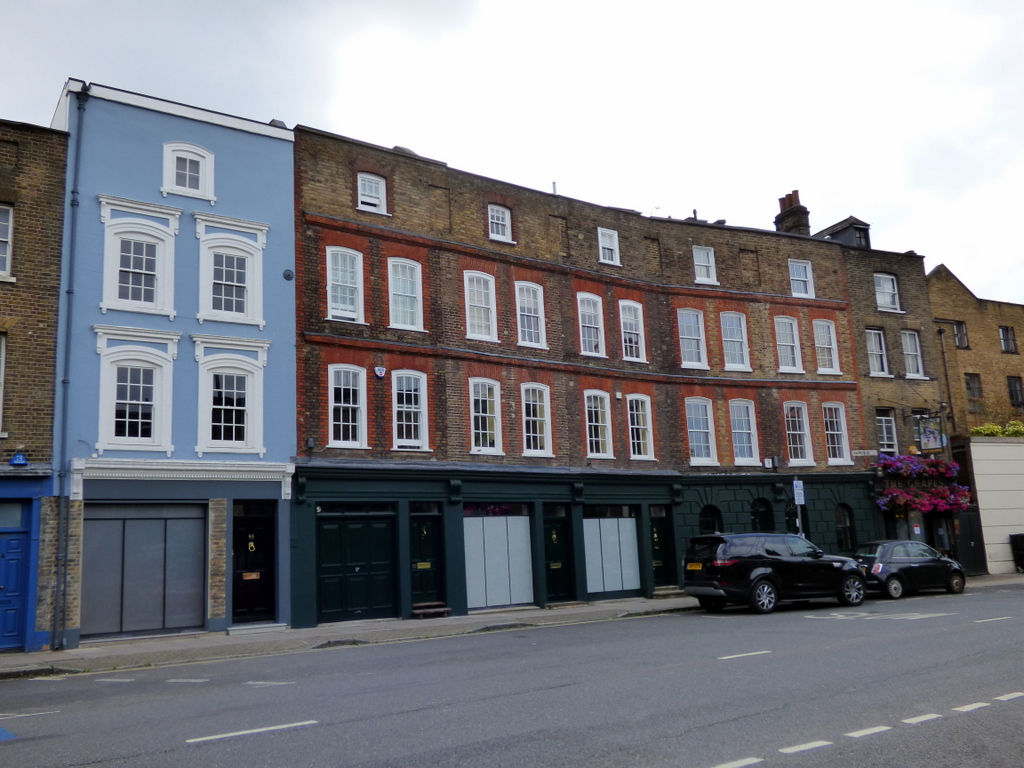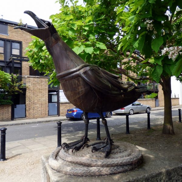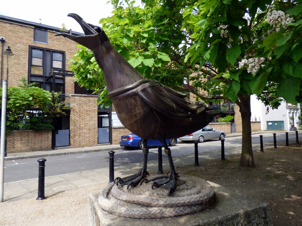 We had lunch on a patch of gravel, underneath trees, on benches on Narrow Street, just outside Ropemakers Fields. Narrow Street offered a beautiful example of early Georgian terraced architecture, which had been derelict until some of the Cambridge set restored it in 1964. The lunch point boasted a work of public art, Herring Gull by Jane Ackroyd, 1994. The pub The Grapes looked enticing. A short diversion from the lunch spot took us to Limekiln Dock, at which is a wide panoramic view of the Thames, south towards Greenwich and west towards the City (Shard, Walkie Talkie, Gherkin, Cheesegrater and all the rest).