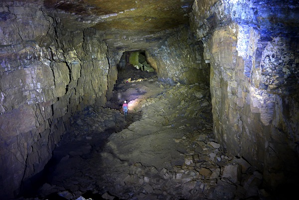 The next day being Sunday, and we being in Wales, it was surely proper to visit a place of worship. Not that most of our party knew that the name of the cave we visited, “Eglwys Faen”, translates as “Stone Church”. Come to that, not that most of our party went there anyway! Just Martin, Tabitha, and I walked from where we were staying at the White Walls caving hut to Eglwys Faen. The others preferred relaxation. Tabitha led the way most of the time, along a maze of crawls on cushiony, packed-mud floors. It was positively restful after all the boulder hopping of the day before.