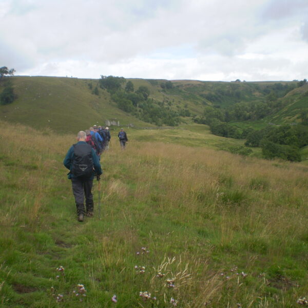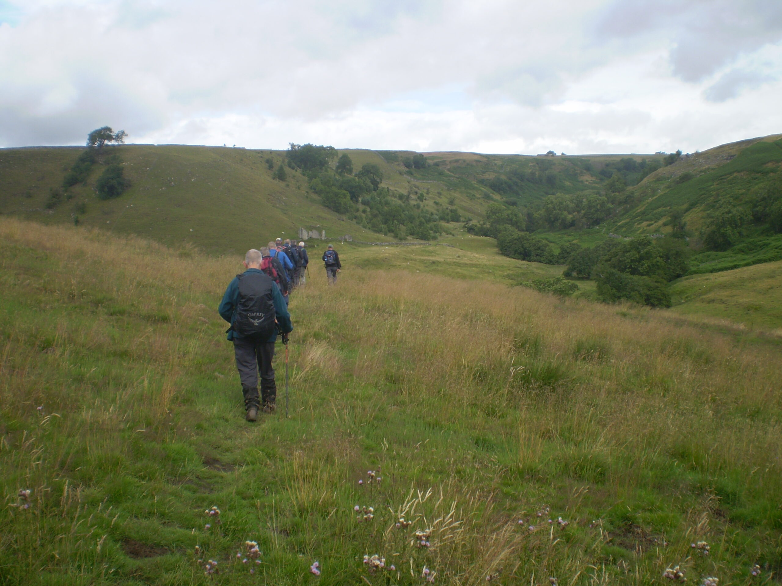 A steep scramble down to the nearby Holgate Beck and up the other side led us back to wide moorland views, and a well-maintained path towards the tiny hamlet of Washfold.  Here we turned down a small, secluded valley to the house of Chris one of our longest-standing members who kindly invited us to a lunch stop, with cake, in his garden.