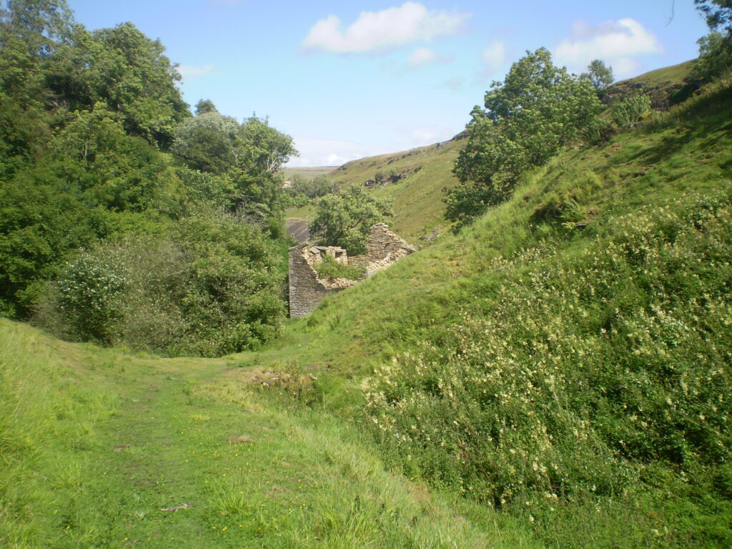 Suitably refreshed, and continuing further down the same valley, we soon reached the remains of the lead mine.  A few abandoned stone buildings, water courses and intriguing passageways into the hillside hinted at the activity that would have taken place here a few hundred years ago.  All was peaceful now, and we enjoyed an easy path alongside the beck, passing again close to the teashop that we had seen earlier.