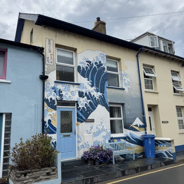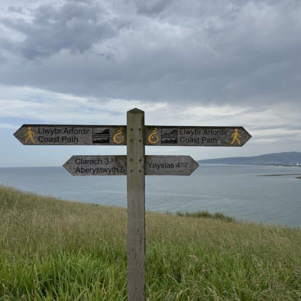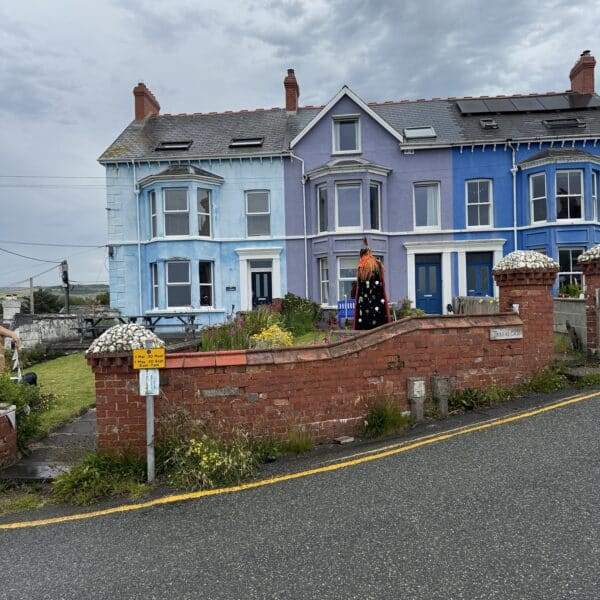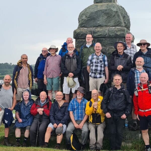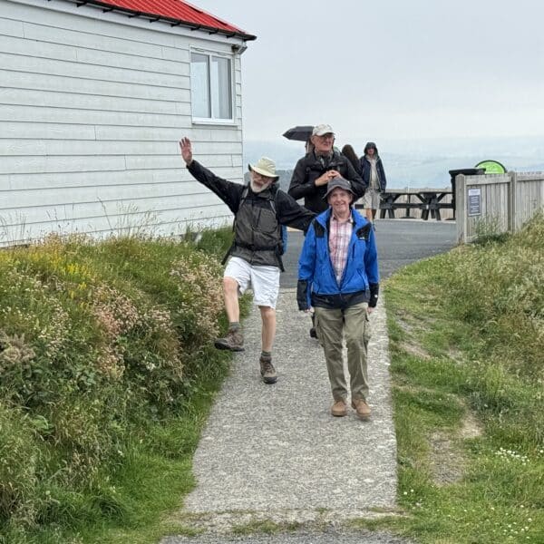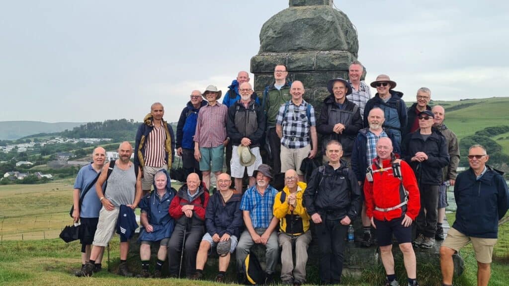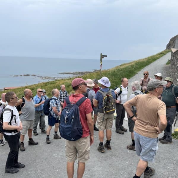 After lunch we continued on along the coast path, memorable quotes being “it can’t be any worse going down” “there are steps where it gets really steep” and from an unnamed walk leader “look at that rock outcrop, it’s just waiting to fall into the sea” our path ahead was on said outcrop! Having paused for a group photo by the War Memorial on the headland above Borth, we all made it safely down to the town in brilliant sunshine, where the locals had decorated the town for our arrival. Some visited a cafe whilst others favoured a beach front pub, but we all made it to the station on time for our train ride back to Aberystwyth. We rounded the day off with an excellent meal, again perfectly organised by Martin Darby. Thanks Martin for a great day, of what was to be, a fantastic weekend away.