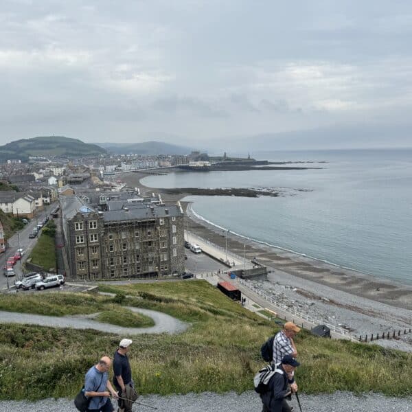 On a fine morning 27 GOC walkers, mostly from the Western Midlands group assembled under the clock tower of Aberystwyth Railway Station. We were all on our best behaviour as one of the visitors was Deputy Chairman Martin Gilbraith! We were pleased that another Martin aka Western Midlands Joint Group Coordinator Mr Darby was looking bright eyed and bushy tailed, as the previous evening he had been knocking back what he claimed were non alcoholic cocktails. We progressed up a fairly steep hill to the top of the funicular railway to meet the 3 who had elected to travel that way. Sadly we had to wait whilst they finished their coffee and cake! As you can see from the photo, when they finally joined us they were very contrite, NOT.