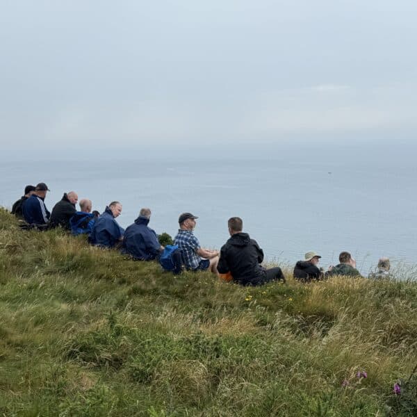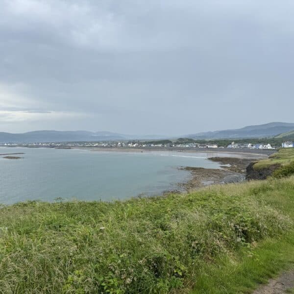 We continued along the high path towards our destination Borth. There was much lively conversation as friends old and new chatted away. Unfortunately the promised views of the Lleyn Peninsula failed to materialise, I think this was probably due to the suns reflection on the sea. We paused for lunch, where some brave walkers perched on the cliff edge to eat.