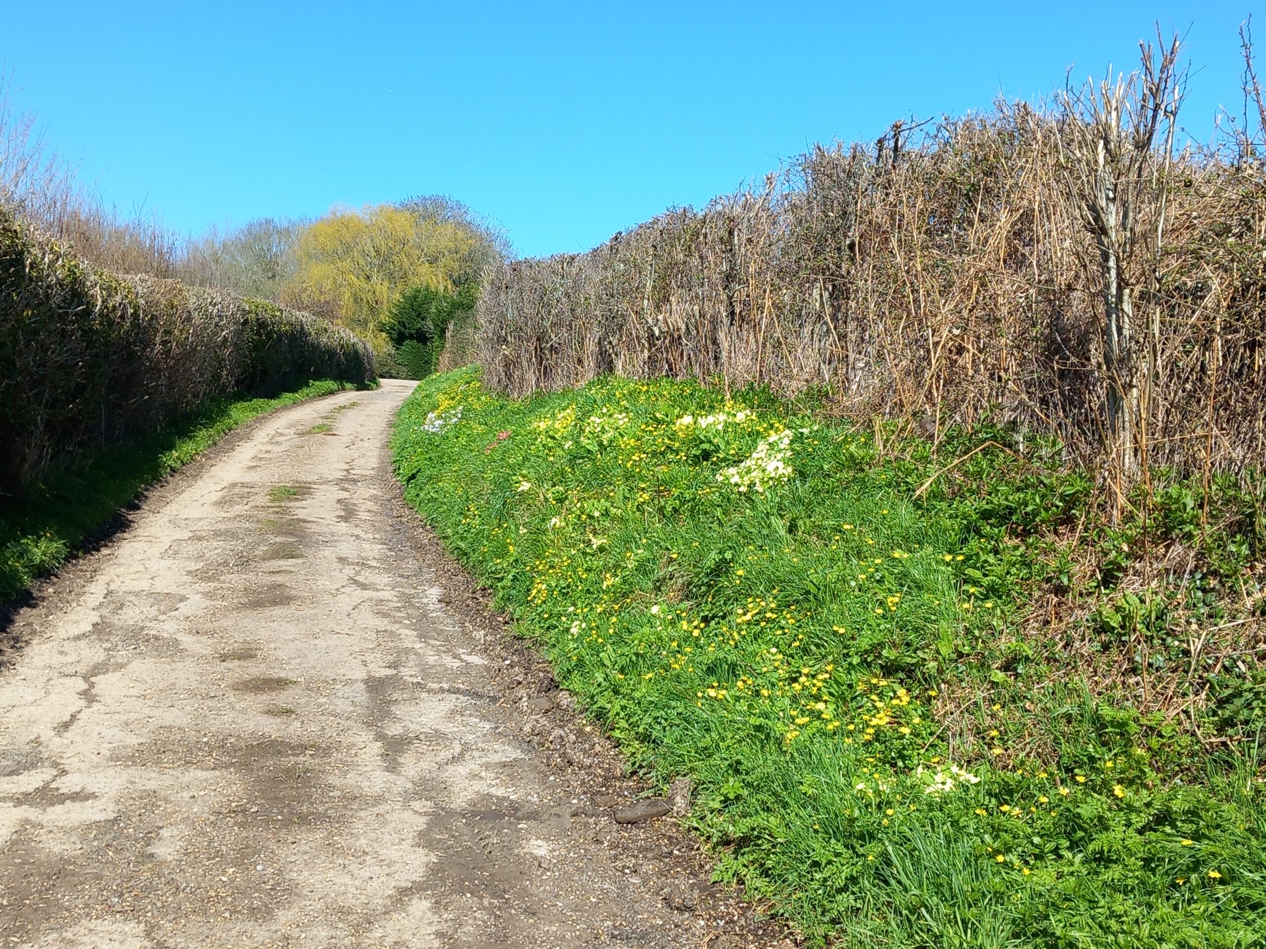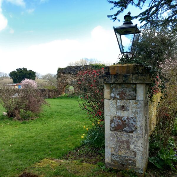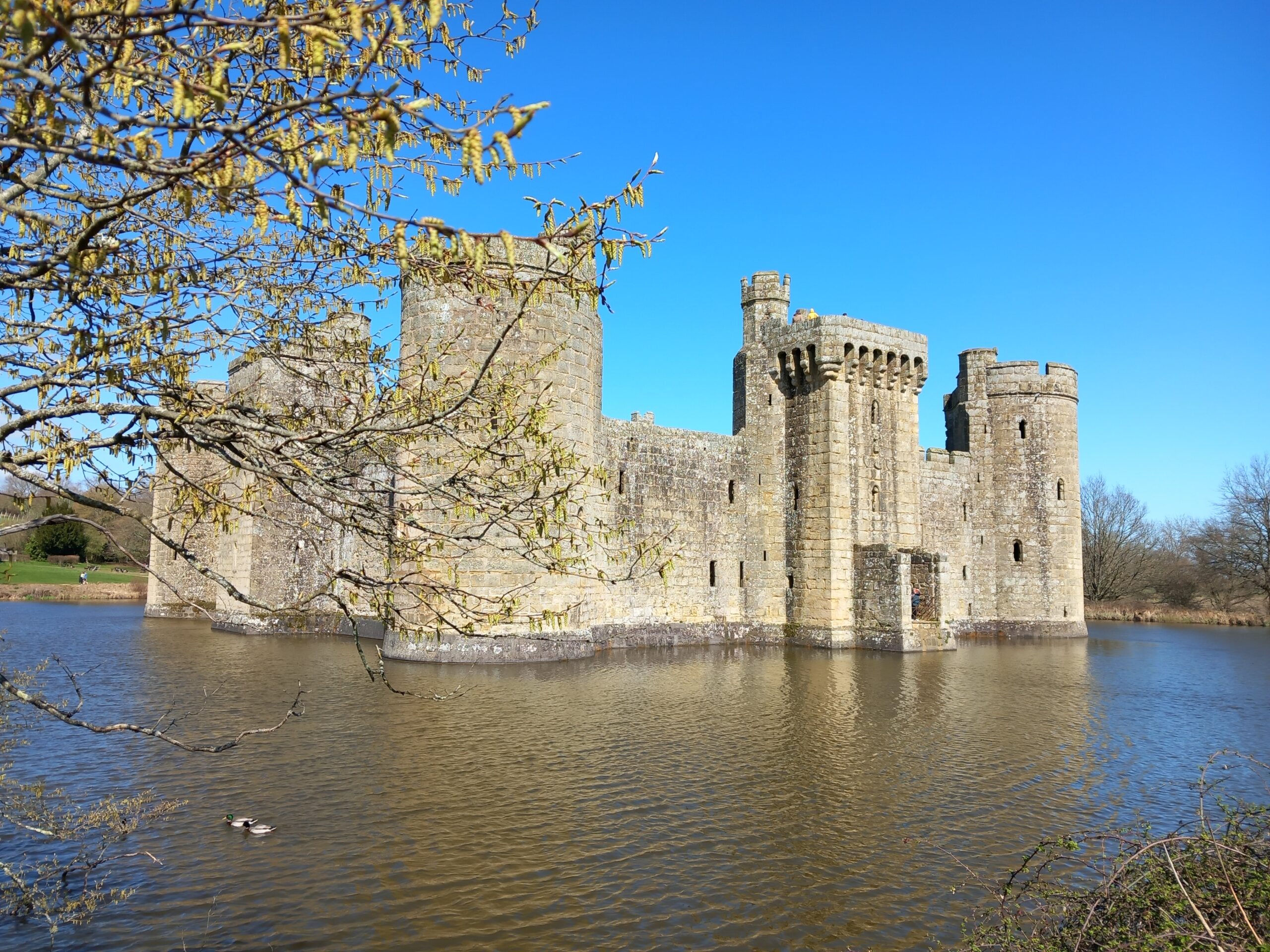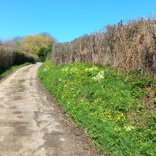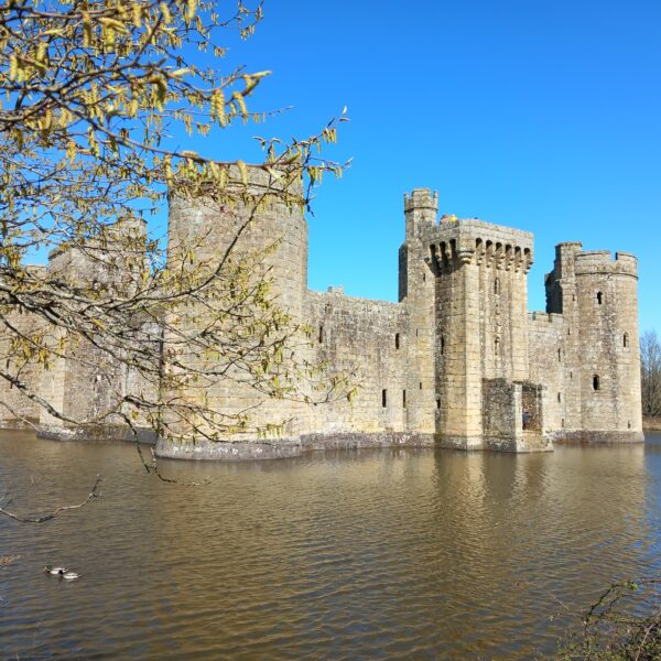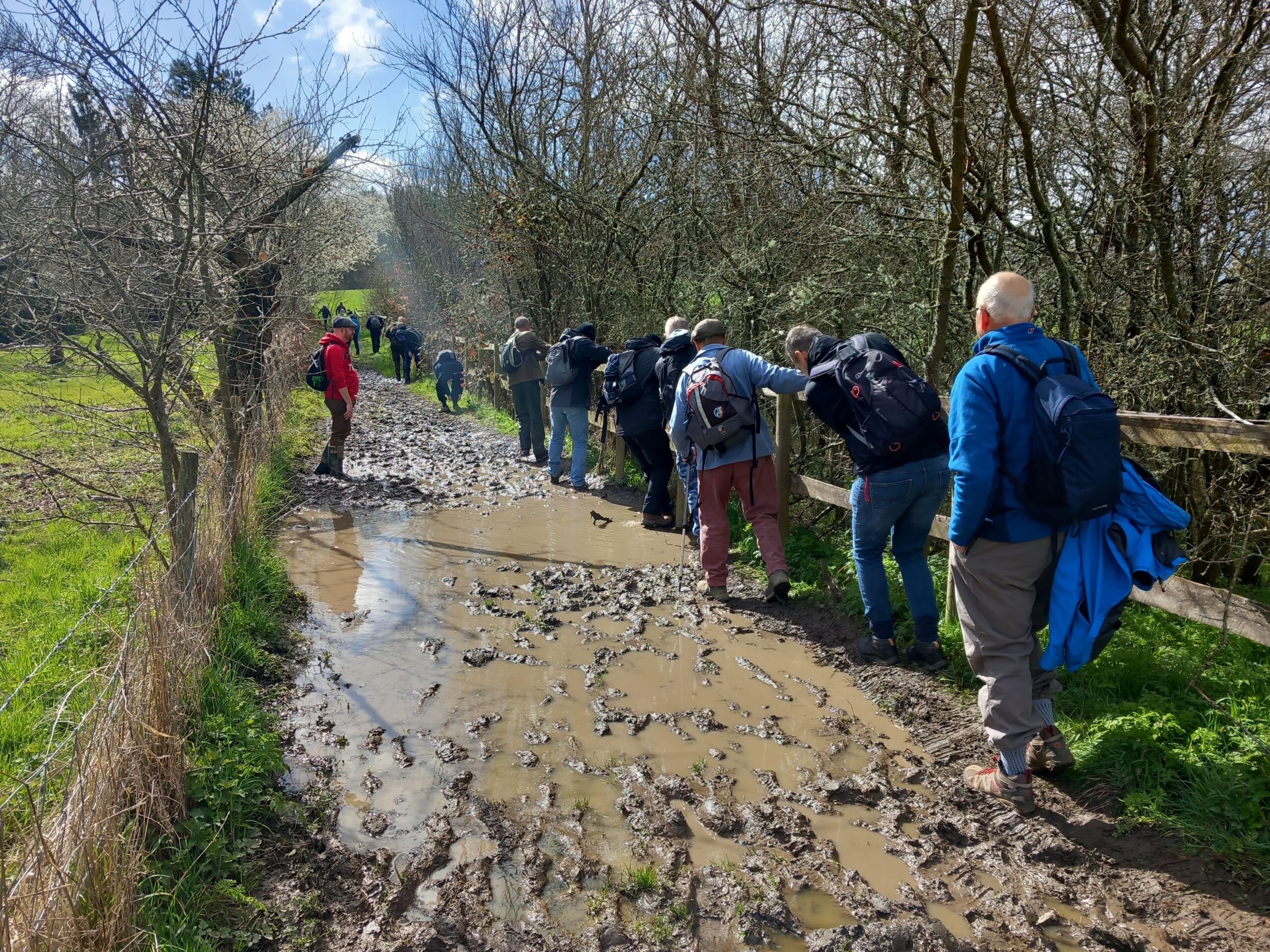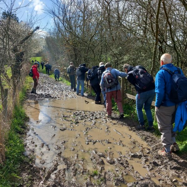 A wonderfully sunny spring-like day for this month's joint West Kent & Sussex walk. A great turnout of 18, including one prospective new member, and an excitable dog, Mabel! Although very wet and muddy underfoot, we were not deterred, firstly walking through Robertsbridge to the remains of the old abbey, then on to Ewhurst Green passing hop fields and orchards. Our lunch stop was at the White Dog Inn at Ewhurst Green, overlooking Bodiam Castle in the valley below. The landlord had kindly allowed us to eat our packed lunches in the garden in return for buying a drink or two.