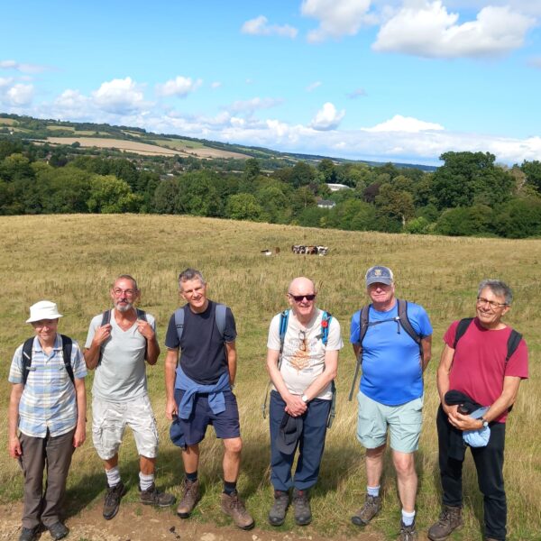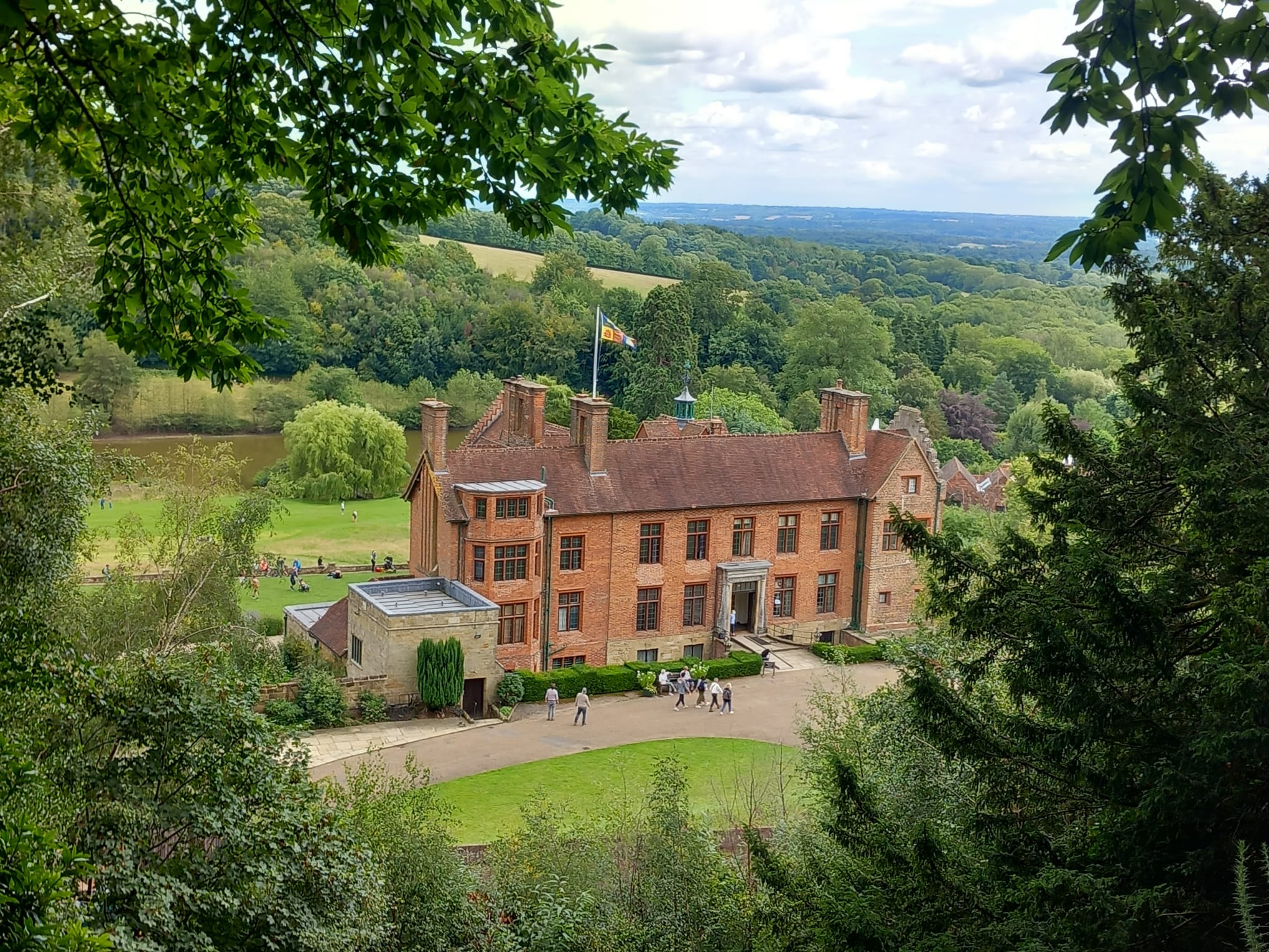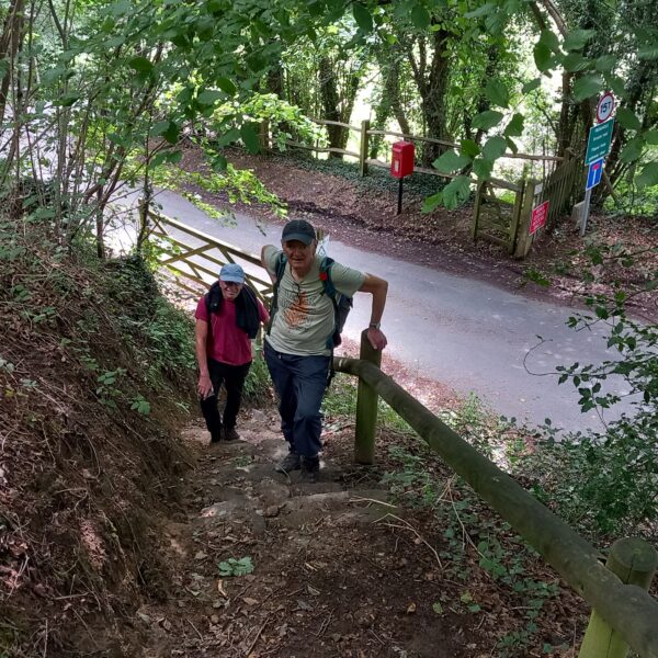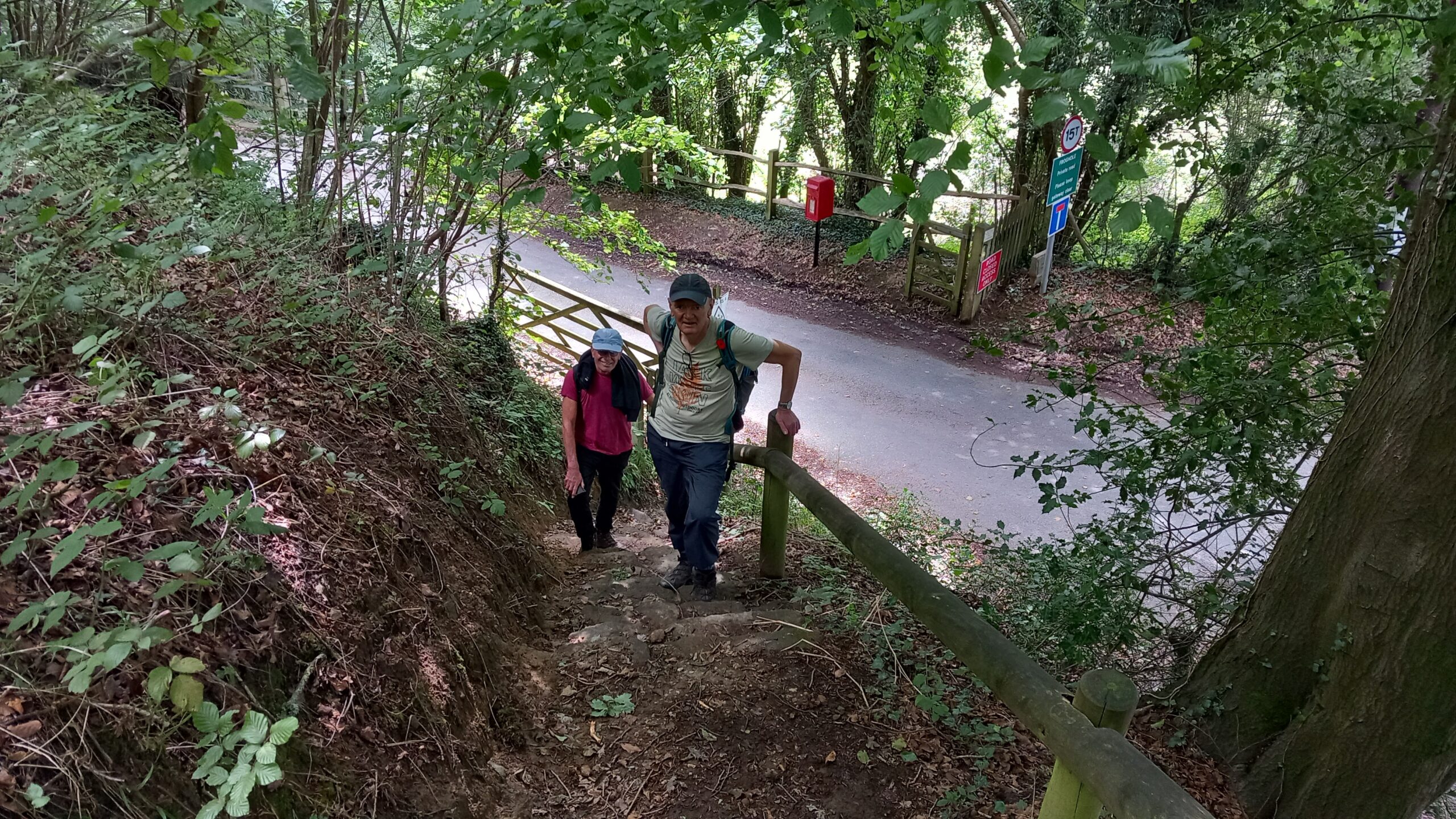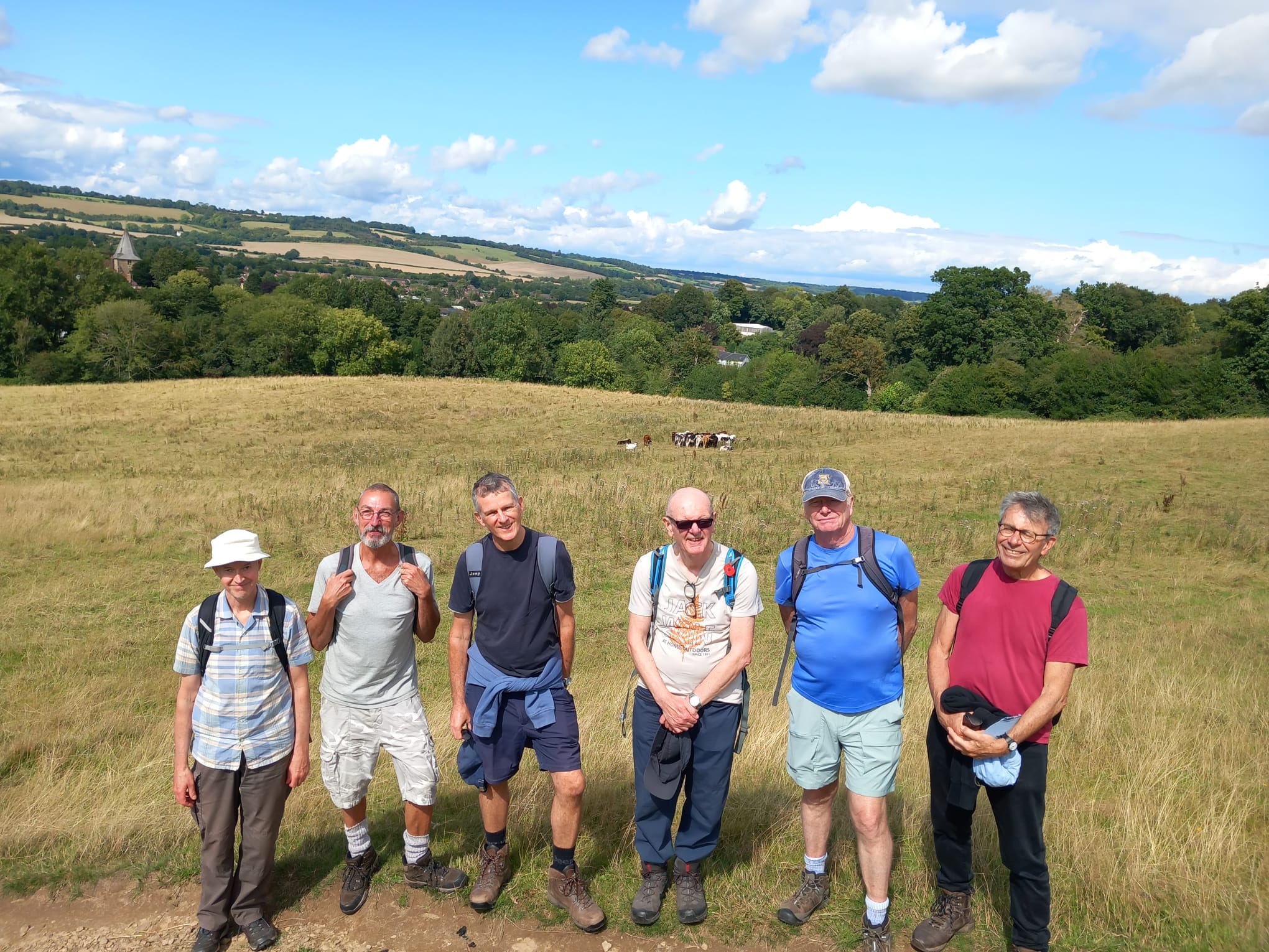 Our lunch stop was in the churchyard where Octavia Hill was laid to rest, one of the founders of the National Trust. Following lunch, we crossed fields before the steep climb up Jacob's Ladder to Froghole and more splendid views, this time southwards over The Weald with Ashdown Forest on the horizon. Further on, was a clearing in the trees which allowed a glimpse of Chartwell and its farm (where the group photo was taken). Now descending steeply, the path took us close to the entrance of Chartwell before rising up to Puddledock Lane and French Street further on.